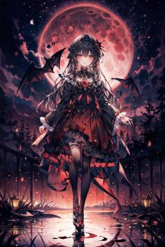 (masterpiece, 4k, best quality, highly detailed, 1girl, solo),1girl, solo, watercolor, moonlit, mystical, ethereal, delicate, serene, dark colors, vibrant reds, crescent moon, stars, flowing hair, short hair, black hair, moon-shaped hairpin, large eyes, innocent expression, pale skin, small figure, Lolita fashion, frilly dress, black and red color scheme, lace details, knee-high socks, Mary Jane shoes, blood moon, ominous atmosphere, wispy clouds, eerie shadows, glowing red eyes, moonlight reflecting on the ground, bats flying in the background, silhouette of a spooky tree, misty forest, haunted ambiance, enchanted aura, stillness, magical girl, blood-red ribbons, moonlit path, nightfall, mysterious beauty, gothic elements, solemn expression, hidden powers, moonlit lake, reflection, tranquility, nocturnal creature, otherworldly presence, midjourney