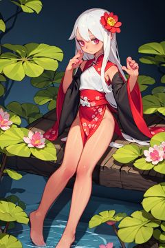 <lora:2qhuafeng-000014:0.7>,masterpiece,best quality,1girl,8K,HDR,white hair,xuancai, 1girl, flower, hair ornament, solo, lily pad, sitting, pointy ears, holding, barefoot, black hair, long hair, leaf umbrella, dark-skinned female, minigirl, water, hair flower, long sleeves, bangs, wide sleeves, outdoors, bag, looking at viewer, bare legs, closed mouth, lotus, leaf, hands up