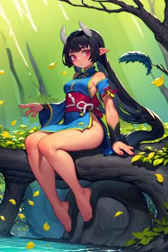 <lora:2qhuafeng-000008:0.7>,xuancai, multiple girls, dress, tree, long hair, outdoors, partially underwater shot, tail, water, sitting, black hair, day, short sleeves, barefoot, nature, sunlight, horns, leaf