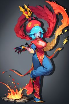 masterpiece,best quality,8K,HDR,<lora:2qhuafeng-000008:0.6>,lei lei, blue skin, 1girl, jiangshi, flipped hair, hat, blush stickers, qing guanmao, cleavage cutout, clothing cutout, chinese clothes, solo, ofuda, claws, simple background, standing on one leg, white background, open mouth, standing, smile, pants, 2qhuafeng, designed by Atey Ghailan, Loish, Bryan Lee O'Malley, Cliff Chiang and Greg Rutkowski, concept art, landscape of a Burning (The House of the Undying in Qarth:1.3) , field, Bathed in shadows, Masterpiece, Horror, Velvia
