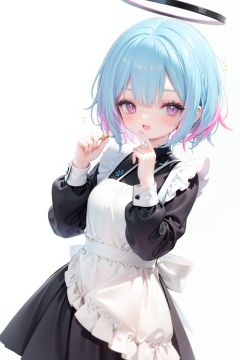 1girl, solo, apron, halo, hair over one eye, closed eyes, smile, white background, dress, white apron, simple background, long sleeves, multicolored hair, braid, open mouth, blue hair, alternate costume, blush, bangs, :d, pink hair, black dress, ribbon, frilled dress, enmaided, short hair, hand up, colored inner hair