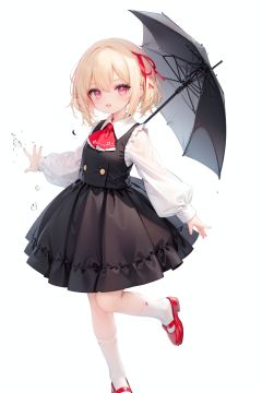 1girl, rumia, blonde hair, solo, white background, red eyes, red footwear, simple background, ascot, short hair, ribbon, open mouth, hair ribbon, smile, long sleeves, shirt, looking at viewer, red ascot, white socks, white shirt, red ribbon, shoes, socks, frills, bangs, outstretched arms, hair between eyes, skirt, :d, dress, vest, mary janes, black dress, black skirt, collared shirt, black vest, blush
