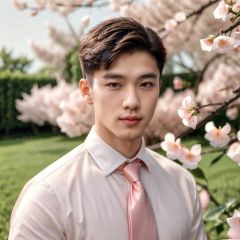 masterpiece,1 Man,Handsome,Look at me,Brown eyes,Short hair,Oil head,White shirt,Tie,22 years old,Outdoor,Garden,Peach tree,Flying petals,textured skin,super detail,best quality,