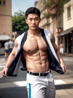 realistic,masterpiece,best quality,cinematic lighting,natural shadow,highest detail,professional photography,detailed background,depth of field,insane details,intricate,aesthetic,detailed face,subsurface scattering,realistic hair,realistic eyes,muscular,masculine,large pectorals,photo of a handsome asian man,(20 year old),black hair,beige-color,open clothes,shirt,belt,pants,cuffs,dynamic pose,outdoor,city street,
