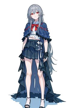 (masterpiece:1.3),(the best quality:1.2),(super fine illustrations:1.2),(Masterpiece),high quality,high detail,(white background:1.2),looking at viewer,(SOLO:1.4),outline,simple background,<lora:阿识-6周年:0.8>, pleated skirt,high heels,red eyes,hair ornament,capelet,very long hair,skirt,long sleeves,hair between eyes,grey hair,bow,black skirt,bangs,long hair,