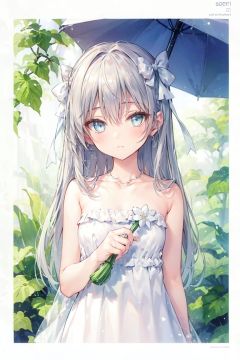 1girl, solo, dress, looking at viewer, long hair, holding, bangs, sleeveless, leaf, page number, bare shoulders, white dress, sleeveless dress, blue eyes, ribbon, closed mouth, collarbone, leaf umbrella, white ribbon, upper body, shiny, shiny hair, hair ribbon, simple background, blush, halterneck, artist name, hair between eyes, water drop, wings
