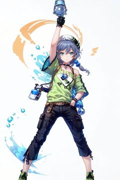 (masterpiece:1.3),(the best quality:1.2),(super fine illustrations:1.2),(Masterpiece),high quality,high detail,(white background:1.2),looking at viewer,(SOLO:1.4),outline,simplebackground,, belt,shorts,bag,shoes,off shoulder,watch,choker,sunglasses,button badge,collarbone,t-shirt,multicolored hair,black choker,black pants,wristband,off-shoulder shirt,bangs,hair flaps,hair between eyes,grey hair,fu hua,green shirt,sneakers,shortsleeves,
