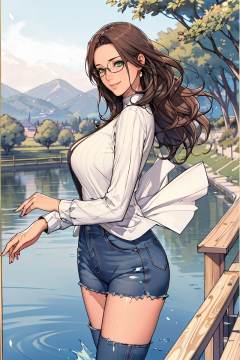 (masterpiece),(best quality),highres,incredibly absurdres,absurdres,very_high resolution,original,intricate details,hyper detail,ultra-detailed,exquisite detailed,extremely delicate,illustration,chromatic aberration,film grain,cinematic,bokeh,caustics,emphasis lines,extremely detailed CG,unity 8k wallpaper,(1girl),shiny hair,glossy hair,sharp_eyelid,eyeliner,eyelashes,eyeshadow,tall female,mature female,*******,perfect detailed face,lips,(lipgloss),feminine proportions,skinny,toned,slim,wide hips,curvy,large_breasts,perky_breasts,shiny skin,glossy skin,(long legs),cropped legs,cowboy shot,knee,(detailed beautiful scene),scenery,landscape,bloom,picturesque,UHD wallpaper,HDR,global illumination,volumetric light,wavy hair,forehead,parted bangs,lateral view,long hair,hair behind ear,brown hair,(floating hair:1.2),green eyes,smile,light smile,grin,jeans,buttons,long sleeves,white blouse,earrings,knee boots,black footwear,smartwatch,flower,sunlight,park,plant,nature,outdoors,lake,pavement,mountainous horizon,clear sky,motion blur,waves,tree,(round eyewear),glasses,circle-glasses,<lora:oda non 03:0.8>,