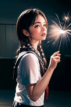 masterpiece,best quality,shishangmote \(sheying\),1girl, solo, sparkler, school uniform, fireworks, serafuku, braid, twin braids, black hair, realistic, skirt, parted lips, holding, short sleeves, lips, black eyes, long hair,artistic fashion,photographic texture,studio lighting,high resolution cinema-grade color scheme,intense contrast,Art fashion,photographic texture,studio lighting,high resolution,<lora:shishangmote-000010:0.6>,