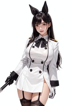 Realistic style, film-grade works, 8K wallpapers, masterpieces, depth of field, edge lighting, volume lighting, two-tone lighting, very realistic quality, the material lighting surface has bright spots and highlights, and the highlights flash and have a mirror effect when reflecting, , , 1 girl, mature female, solo, full body, looking at viewer, lace, strong rim light, , , simple background, grey background, , colorful, (detailed skin: 1.3, detailed face: 1.3), clear focus, delicate, (mature women: 1.2), (glossy skin+glossy skin: 1.4), (sweating: 1.1), (big_eyes), red_ eyeshadow, long_ Eyelashes, red lips, , , (aidang1, 1girl, animal ears, long hair, black hair, large breasts, mole, extra ears, mole under eye, bangs, brown eyes, hair ribbon, swept bangs, blush, thighhighs, breasts, gloves, uniform, skirt, high heels, garter straps, military, military uniform, white gloves, black thighhighs, pencil skirt, miniskirt, ribbon, white footwear, white ribbon, long sleeves, buttons, sheathed, white skirt, sheath, double-breasted, jacket, white jacket, side slit, weapon, sword, turret, machinery, rigging, smile, looking at viewer, closed mouth, holding, solo, white background, full body, simple background, :1.3), <lora:EMS-76881-EMS:0.400000>