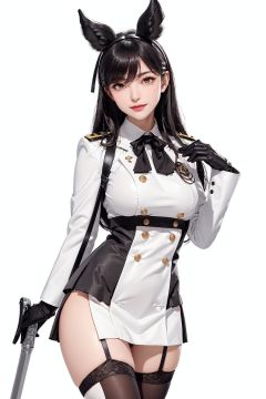 Realistic style, film-grade works, 8K wallpapers, masterpieces, depth of field, edge lighting, volume lighting, two-tone lighting, very realistic quality, the material lighting surface has bright spots and highlights, and the highlights flash and have a mirror effect when reflecting, , , 1 girl, mature female, solo, full body, looking at viewer, lace, strong rim light, , , simple background, grey background, , colorful, (detailed skin: 1.3, detailed face: 1.3), clear focus, delicate, (mature women: 1.2), (glossy skin+glossy skin: 1.4), (sweating: 1.1), (big_eyes), red_ eyeshadow, long_ Eyelashes, red lips, , , (aidang1, 1girl, animal ears, long hair, black hair, large breasts, mole, extra ears, mole under eye, bangs, brown eyes, hair ribbon, swept bangs, blush, thighhighs, breasts, gloves, uniform, skirt, high heels, garter straps, military, military uniform, white gloves, black thighhighs, pencil skirt, miniskirt, ribbon, white footwear, white ribbon, long sleeves, buttons, sheathed, white skirt, sheath, double-breasted, jacket, white jacket, side slit, weapon, sword, turret, machinery, rigging, smile, looking at viewer, closed mouth, holding, solo, white background, full body, simple background, :1.3), <lora:EMS-76881-EMS:0.400000>