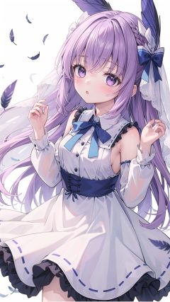 1girl, solo, looking_at_viewer, (purple_eyes:1.2), shirt, long_sleeves, white_background, , (purple_hair:1.2), parted_lips, sleeveless, :o, sleeves_past_wrists, hands_up, sleeveless_dress, blue_dress, one_side_up, frilled_dress, feathers, blue_ribbon, white_ribbon, puffy_long_sleeves, white_feathers, wing_hair_ornament, headdress, veil, bow, frill, blue dress