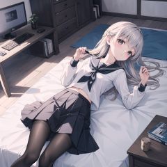 ((masterpiece)),(((best quality))),(ultra-detailed),(best illustration),(best illumination, best shadow),((an extremely delicate and beautiful)),dynamic angle,floating,(Short focal length)(Long object distance)(back depth of field),chowbie_jue,bangs,black_bow,black_pantyhose,black_skirt,blurry,blurry_background,bow,braid,brown_eyes,grey_hair,hair_between_eyes,hair_bow,hand_up,highres,legs,long_hair,long_sleeves,looking_at_viewer,original,black background,pantyhose,pleated_skirt,puffy_long_sleeves,puffy_sleeves,sailor_collar,shirt,skirt,solo,standing,white_sailor_collar,white_shirt,solo,messy room,loaded interior,bedroom,(((otaku room))),(computer)wide shot,(lying on back:1.3), Herb Ritts,cowboy shot,fisheye