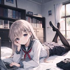 ((masterpiece)),(((best quality))),(ultra-detailed),(best illustration),(best illumination, best shadow),((an extremely delicate and beautiful)),dynamic angle,floating,(Short focal length)(Long object distance)(back depth of field),chowbie_jue,bangs,black_bow,black_pantyhose,black_skirt,blurry,blurry_background,bow,braid,brown_eyes,grey_hair,hair_between_eyes,hair_bow,hand_up,highres,legs,long_hair,long_sleeves,looking_at_viewer,original,black background,pantyhose,pleated_skirt,puffy_long_sleeves,puffy_sleeves,sailor_collar,shirt,skirt,solo,standing,white_sailor_collar,white_shirt,solo,messy room,loaded interior,bedroom,(((otaku room))),(computer)wide shot,(lying on back:1.3), Herb Ritts,cowboy shot,fisheye