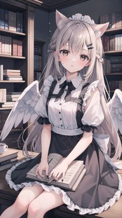 multiple girls, 2girls, maid, wings, apron, animal ears, maid headdress, indoors, angel wings, hair ornament, dress, maid apron, feathered wings, book, black nails, sitting, hairclip, long hair, instrument, grey hair, bookshelf, brown eyes, black dress