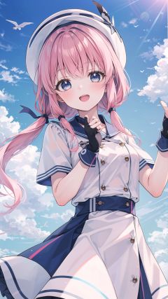 short sleeves, 1girl, white shirt, shirt, mizunashi akari, gloves, pink hair, hat, smile, aria company uniform, bangs, open mouth, sidelocks, short hair with long locks, blush, sky, fingerless gloves, holding, dress, blue eyes, cloud