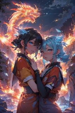masterpiece,best quality,(photorealistic:1.4),(the collision of flames and ice:1.4),(ultra detailed:1.3),masterpiece,(流动的:1.4),(2girls:1.4),cat ears,(upper_body:1.4),unity 8k wallpaper,solo,(flames and ice burst in the air:1.3),snow,ice cube,(colorful:1.4),brilliant brilliance,ice explosion,raytracing,(starry:1.2),cloud,star \(sky\),starry sky,the surging light,<lora:bingtyhuozhige_20230826123206-000010:0.9>,(looking at viewer:1.4),typing art,(ice dragon:1.3),(fire dragon (inazuma eleven):1.2),<lora:Light_and_Shadow:0.4>,