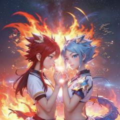 masterpiece,best quality,(photorealistic:1.4),(the collision of flames and ice:1.4),(ultra detailed:1.3),masterpiece,(流动的:1.4),(2girls:1.4),cat ears,(upper_body:1.4),unity 8k wallpaper,solo,(flames and ice burst in the air:1.3),snow,ice cube,(colorful:1.4),brilliant brilliance,ice explosion,raytracing,(starry:1.2),cloud,star \(sky\),starry sky,the surging light,(looking at viewer:1.4),typing art,(ice dragon:1.3),(fire dragon (inazuma eleven):1.2),<lora:Light_and_Shadow:0.4>,<lora:BiFangBird:0.5>,<lora:bingtyhuozhige_20230826123206-000010:0.5>,