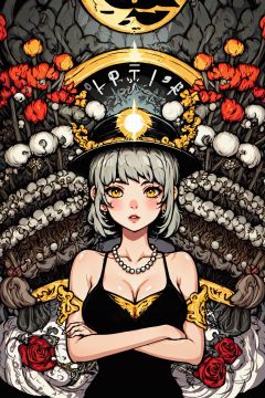 tuya,(masterpiece, 4k, best quality, highly detailed, 1girl, solo),1girl, jewelry, breasts, solo, hat, earrings, white headwear, black hair, cleavage, dress, necklace, looking at viewer, flower, white dress, black flower, short hair, black rose, upper body, parted lips, rose, bangs, collarbone, grey background, sun hat, medium breasts, yellow eyes, pearl necklace, large breasts, see-through, hair between eyes, brown eyes, hat flower, blush, midjourney, Colorful portraits
