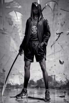 (masterpiece:1.2), best quality, Death Durant,glowing eyes,, hood, holding, greyscale, sneakers, shorts, shoes, weapon, 1boy, hood up, scythe, male focus, horror (theme), realistic, holding weapon, skeleton, looking at viewer, standing, jewelry<lora:Death Durant_20231101213836-000018:1> <lora:add_detail:0.5>