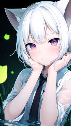 best quality, (chromatic aberration), (beautiful young female:1.4), (streaming tears),sad, (catnip), (catnip), (catnip), looking at viewer, partially submerged, both hands on own cheek, {see-through long shirt},Cat ears, (white hair, short hair, bangs:1.2), (glowing eyes),black background, (prismatic),