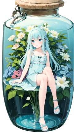 masterpiece, best quality, 1girl, in a jar, jar, simple background, full body, flower, sitting