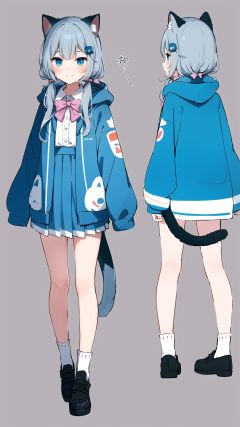 1girl, animal ears, multiple views, sleeves past wrists, twintails, tail, cat ears, hood, hood down, cat girl, shirt, grey hair, white shirt, cat tail, skirt, closed mouth, blue eyes, socks, sleeves past fingers, jacket, hair ornament, hooded jacket, collared shirt, virtual youtuber, open clothes, blue background, long hair, bow, bangs, shoes, animal hood, open jacket, striped, dress shirt, low twintails, fake animal ears, long sleeves, hairclip, pleated skirt, blue skirt, frills, simple background, blue bow, blue jacket, smile, drawstring, looking at viewer, black footwear