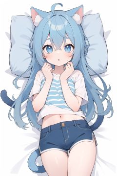 1girl, striped shorts, cat tail, stuffed cat, solo, shirt, blue hair, legs up, stuffed toy, blue eyes, cat ears, shorts, cat girl, stuffed animal, short shorts, animal ears, tail, bangs, lying, on back, white shirt, long hair, short sleeves, blue shorts, feet out of frame, looking at viewer, striped, hair between eyes, blush, parted lips, bed sheet, ass, :o, pillow, eyebrows hidden by hair