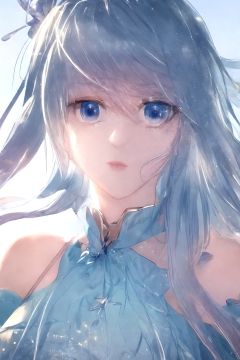 1girl,solo,blue_eyes,long_hair,blue hair,bare_shoulders,dress,multicolored_hair,detached_sleeves,facial_mark,forehead_mark,blue_dress,hair_ornament,detached_collar