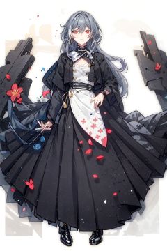 (masterpiece:1.3),(the best quality:1.2),(super fine illustrations:1.2),(Masterpiece),high quality,high detail,(white background:1.2),looking at viewer,(SOLO:1.4),outline,simplebackground,, hair between eyes,red eyes,long hair,very long hair,earrings,cross-laced footwear,boots,multicolored hair,tassel,wide sleeves,low-tied long hair,long sleeves,long skirt,jewelry,hair ornament,grey hair,floral print,black skirt,senti,grey_hair,hair_between_eyes,