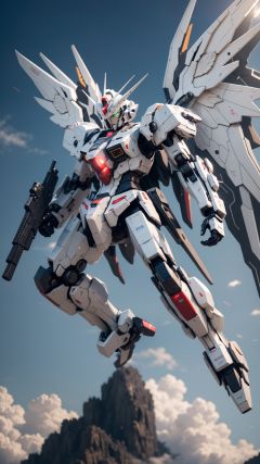 Hyperrealistic art BJ_Gundam,solo,holding,green_eyes,weapon,wings,holding_weapon,gun,no_humans,glowing,robot,holding_gun,mecha,glowing_eyes,flying,science_fiction,mechanical_wings,v-fin,energy_gun,beam_rifle,cinematic lighting,strong contrast,high level of detail,Best quality,masterpiece,White background,. Extremely high-resolution details,photographic,realism pushed to extreme,fine texture,incredibly lifelike,<lora:Gundam_Mecha_v5.2:0.7>, . Extremely high-resolution details, photographic, realism pushed to extreme, fine texture, incredibly lifelike