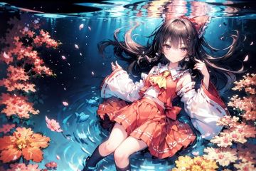masterpiece, ultra detailed,((from above ,socks, lying, underwater, floating hair, starry sky reflection, floating sakura petals, rippling)),[half closed eyes],(pink eyes),(high contrast:0.8),1girl,solo, hakurei_reimu, hair_tubes, detached_sleeves, solo, bow, long_hair, frills, ribbon_trim, red_bow, hair_bow, ribbon-trimmed_sleeves, wide_sleeves, red_skirt, skirt, looking_at_viewer, ascot, stairs, frilled_bow,black_hair,,