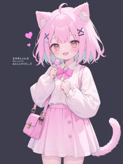 1girl, animal ears, solo, food, tail, cat ears, hair ornament, smile, cat tail, bag, long sleeves, black hair, blush, fang, heart, candy, skirt, looking at viewer, cat girl, animal ear fluff, holding, simple background, multicolored hair, ahoge, short hair, open mouth, bangs, lollipop, shirt, holding food, x hair ornament, shoulder bag, :d, brown eyes, skin fang, pink hair, puffy long sleeves, two-tone hair, yellow eyes, pink skirt, pleated skirt, hairclip, puffy sleeves, blue hair, pink shirt, pink bag