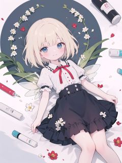 medicine melancholy, blonde hair, 1girl, lily of the valley, flower, su-san, ribbon, skirt, on back, lying, hair ribbon, blue eyes, short hair, short sleeves, solo, looking at viewer, smile, bow, shirt, puffy sleeves, puffy short sleeves, red ribbon, wings, fairy wings