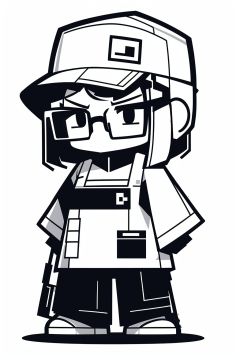 CUXIAN, solo, monochrome, glasses, white background, simple background, greyscale, full body, long sleeves, standing, apron,chibi, hat, employee uniform, 1girl<lora:CUXIAN_20231102160946:1>