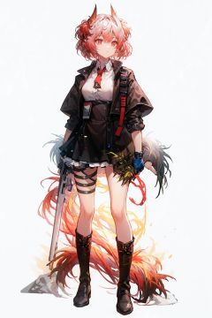 (masterpiece:1.3), (the best quality:1.2), (super fine illustrations:1.2), (Masterpiece), high quality, high detail,((white background:1.2)), looking at viewer, (SOLO:1.4),outline,,simple background,gradient hair,thighhighs,feathers, open clothes, pleated skirt, red ribbon, miniskirt, knee boots, suit, animal ears, red necktie, floating hair, necklace, thigh holster, black skirt, boots, black jacket, black footwear, thighs, collared shirt, thigh strap, pink hair, off shoulder, phoenix, flaming eye, flame, fiery wings, fiery hair, white shirt, necktie, holding gun, skirt, shirt, jacket, holding weapon, gun, black gloves,short hair,hair ornament,red eyes,bangs,hair between eyes,off shoulders,multicolored hair,dress,white hair,jewelry,red hair,long sleeves,gem,streaked hair,1girl, bangs