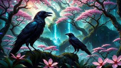 fantasy landscape, jungle, fantasy forest, glowing crystals, magic, glowing sakura tree, fantasy, crow, (masterpiece:1.2), (epic composition:1.4), (talent:1.2), ultra detailed, cinematic lighting, highly detailed, insanely detailed, (photorealistic:1.2), hdr, 8k, exquisite, sharp, elegant, ambient lighting, fantasy vivid colors, high quality,