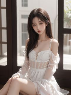 FilmGirl,1girl,solo,black hair,dress,realistic,white dress,long hair,sitting,bare shoulders,looking at viewer,parted lips,breasts,collarbone,black eyes,lips,see-through,off shoulder,small breasts,
