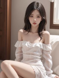 FilmGirl,1girl,solo,black hair,dress,realistic,white dress,long hair,sitting,bare shoulders,looking at viewer,parted lips,breasts,collarbone,black eyes,lips,see-through,off shoulder,small breasts,