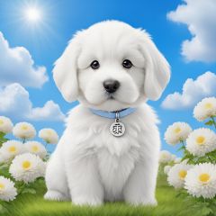 masterpiece, Puppy, Young and young, Lovely, In the middle of the picture, Mid-range, Outdoor, Light blue sky, Clouds, Garden, White chrysanthemum, Big tree, Collar, Furry, Twelve signs of the Chinese zodiac, Corky Dog, HDR, Hairy pets, textured skin, super detail, best quality