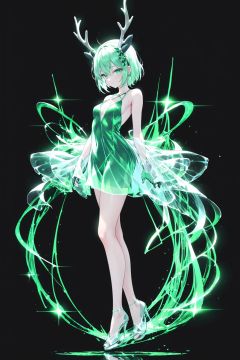 Best quality, 8k,cg,1girl, antlers, solo, short hair, dress, high heels, black background, standing, full body, profile, from side, green hair, simple background, sleeveless, bare shoulders, see-through, breasts, horns, bangs, sleeveless dress, green dress, arms at sides, glowing, multicolored hair, small breasts