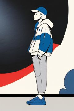 pingmian,bianping,backpack,pants,hat,bag,profile,black pants,baseball cap,jacket,hands in pockets,hood,1boy,long sleeves,standing,white headwear,short hair,from side,hood down,blue eyes,coat,white background,blue hair,print headwear,white jacket,blue jacket,feet out of frame,<lora:20231104-1699071455199-0010:0.8>,