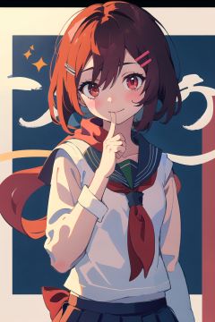 1girl,tateyama ayano,red scarf,solo,scarf,hair ornament,black hair,school uniform,red eyes,enpera,letterboxed,hairclip,smile,white neckerchief,serafuku,long hair,heterochromia,index finger raised,finger to mouth,black serafuku,upper body,black eyes,sailor collar,looking at viewer,long sleeves,neckerchief,shushing,shirt,black shirt,head tilt,closed mouth,bangs,black sailor collar,hand up,looking to the side,hair between eyes,medium hair,<lora:Muse_DashV4-000390:1>,