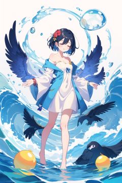 1girl,backless outfit,bare shoulders,bird,black hair,blue dress,blue hair,bracelet,bubble,closed eyes,cloud,collarbone,dress,earrings,flower,hair between eyes,hand on own chest,holding,jewelry,liquid clothes,long hair,looking at viewer,solo,strapless dress,tail,very long hair,water,water drop,waves,white background,white dress,wide sleeves,<lora:Muse_DashV4-000390:0.7>,