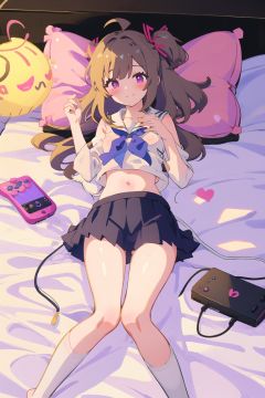 solo,1girl,heart ahoge,thighhighs,ribbon,long hair,lying,ahoge,skirt,school uniform,navel,on back,two side up,serafuku,heart,blue skirt,very long hair,short sleeves,black ribbon,white thighhighs,pleated skirt,hair between eyes,red eyes,white shirt,smile,no shoes,hair ribbon,hair ornament,bangs,shirt,looking at viewer,closed mouth,collarbone,blush,grey hair,bed sheet,breasts,midriff,vibrator,sailor collar,sex toy,hand up,digital media player,dakimakura \(medium\),full body,zettai ryouiki,miniskirt,small breasts,midriff peek,medium breasts,remote control vibrator,sidelocks,x hair ornament,purple eyes,from above,vibrator under clothes,blue sailor collar,red ribbon,shiny,on bed,stomach,knees together feet apart,<lora:Muse_DashV4-000390:1>,