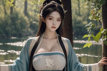 Ultra-high skin detail,Perfect facial details,cinematic lighting,chiaroscuro,super detail,award winning,best quality,FilmGirl,1girl,Lolita,18 years old,Beautiful body,looking at viewer,<lora:汉服chang4:0.8>,(chang:1.2),fabulous hanfu,outdoors,(detailed light) , feather, leaves, nature, (sunlight), river, (forest),(bloom),