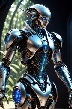 In the midst of this breathtaking landscape, a beautiful and enchanting robot stands as a marvel of both technology and artistry. Its sleek, silver body reflects the surrounding natural beauty, creating a striking contrast with its mechanical form against the organic backdrop. The robot's design is a harmonious blend of elegant curves and intricate details, making it a true masterpiece of engineering. Its eyes, adorned with luminescent blue lights, exude a captivating allure, drawing you into a world where nature and technology coexist in perfect harmony. As the robot gracefully moves through the landscape, its every motion is a dance of precision and grace. Its metallic skin is cool to the touch, yet there's a warmth in its presence that resonates with the serene surroundings. With every step, it leaves imprints on the soft earth, adding a sensual dimension to its interaction with the natural world. This beautiful robot embodies the essence of the landscape, where the boundaries between nature and technology blur, creating a sensory experience that is both alluring and mesmerizing. Together, they form a perfect union of beauty and innovation, inviting you to explore a world where the wonders of the organic and the artificial become one. close up shot, armour