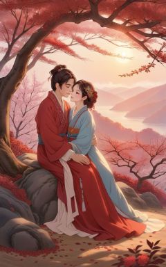 Under a Ormosia hosiei, the autumn leaves piled up like a mountain, and the morning sun shone gently. The two lovers hugged each other tightly, with deep love and missing in their eyes. The soft colors create a strong autumn atmosphere. The beautiful red bean flowers bloom on the branches, and the tree shadows are reflected on the ground, evoking the resonance and emotion of the heart.