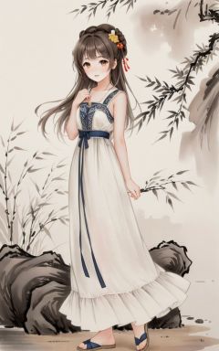 traditional chinese ink painting,willow branches,willow tree in background,wuchangshuo,black and white ink painting,[(white background:1.4)::4],solo,(traditional media:1.3),round image,solo,chibi,1girl,lion ears,lion tail,virtual youtuber,tail,dress,animal ears,solo,long hair,lion girl,white dress,ahoge,full body,yellow eyes,looking at viewer,barefoot,sleeveless dress,brown hair,standing,sundress,sleeveless,white background,bangs,bare legs,bare shoulders,hair between eyes,simple background,frilled dress,bare arms,closed mouth,collarbone,blush,(cute loli),