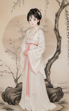 negative space,portrait of a woman standing,willow branches,(masterpiece, best quality:1.2),traditional chinese ink painting,modelshoot style,peaceful,(smile),looking at viewer,(wedding dress:0.8),(mechanical exoskeleton:1),song,willow tree in background,wuchangshuo,(Highest picture quality),(Master's work),(ultra-detailed),(Detailed eye description:1.2),masterpiece,best quality,absurdres,original,extremely delicate and beautiful,beautiful detailed eyes and face,1girl,black_hair,white_clothes,looking_at_viewer,mole,solo,(masterpiece:1.4),(best quality:1.4),hanfu,tang style outfits,pink upper shan,multicolour chest pleated skirt,<lora:tangStyle_sdxl_autodl_v36:0.2>,